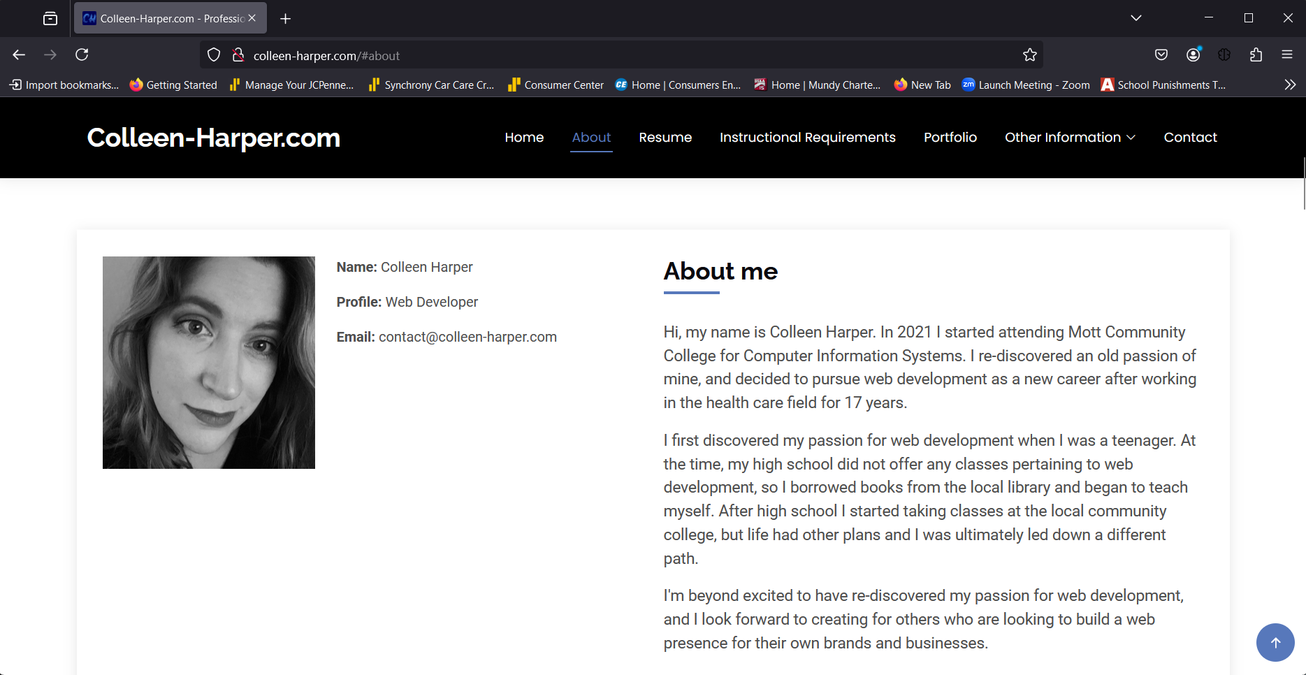 Hi, my name is Colleen Harper. In 2021 I started attending Mott Community College for Computer Information Systems. I re-discovered an old passion of mine, and decided to pursue web development as a new career after working in the health care field for 17 years.